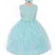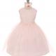 A simple and elegant infant dress with full lace bodice and flower trim decorated on the waist line. Tea length satin skirt with organza overlay.